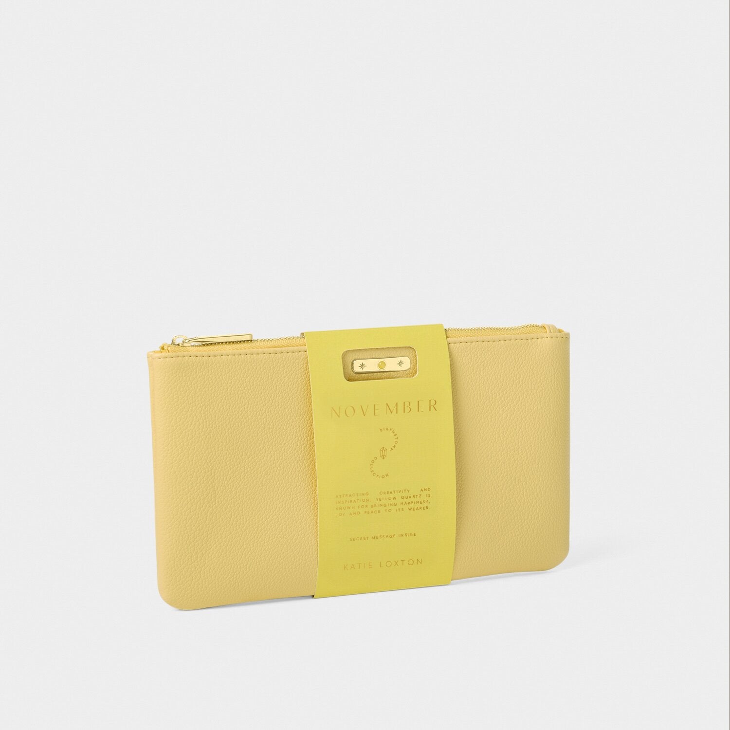 Our 'November' Birthstone Pouch features custom gold-tone hardware, beautifully set with the month’s real semi-precious stone, Yellow Quartz. Inside the zip closure, you’ll discover a hidden message and individual traits that perfectly represent the birthday girl. For the ideal gift, pair this pouch with the matching Birthstone Bracelet and Keyring.