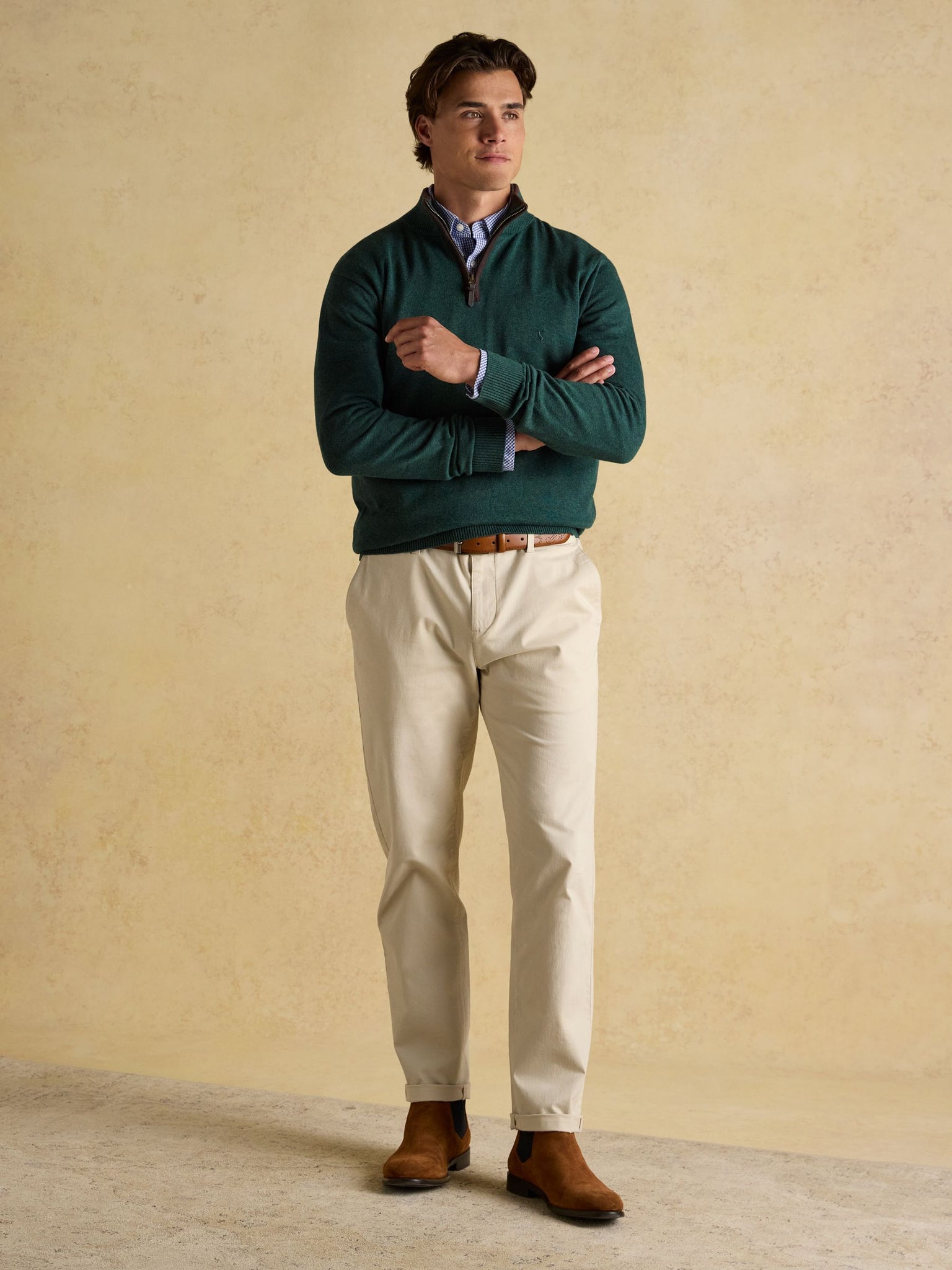 One of our best-loved men's styles, this quarter zip jumper in dark green is crafted from soft yet substantial cotton and is comfy enough for layering and yet dapper enough to wear on its own.