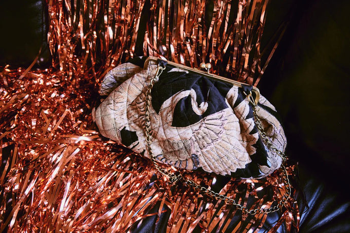 One Hundred Stars Vclcrablk QUILTED VELVET KISS LOCK BAG CRANE BLACK