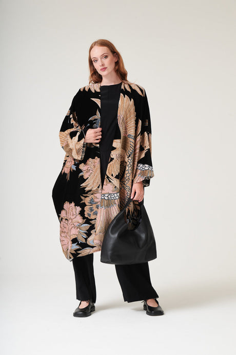 One Hundred Stars Ckmcrablk CRANE BLACK CREPE KIMONO
