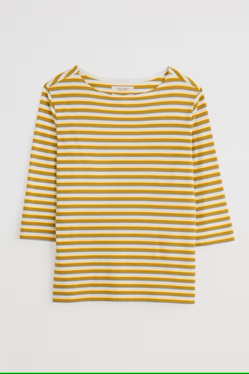 A 3/4 sleeve version of our classic sailor stripes, made with soft and breathable organic cotton, with an elegant boat neck and relaxed fit. The stripes come in a range of coastal colours, and are yarn-dyed for crisp vibrancy. Choose from a range of designs including slim Bretons and Falmouth stripes with a plain yoke. Effortless style perfect for layering. GOTS represents the gold standard of organic cotton, which is grown without harmful fertilisers and pesticides, protecting wildlife, soil quality and people.