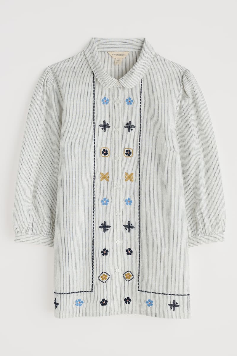 We've taken folk art motifs as inspiration for this beautiful embroidered version of our Hope Cottage blouse. Detailed flower and foliage designs bring contrast and texture to the woven cotton slub creating a subtly distinctive piece that you'll reach for time and again. Soft blouson sleeves and relaxed shape make this an easy-wearing blouse that's perfect with denim.