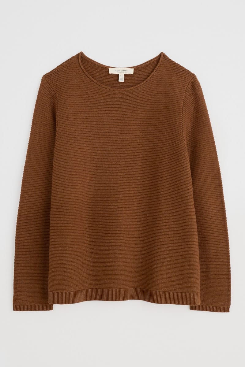This organic cotton jumper has a simple, easy-fit silhouette, bracelet length sleeves and a crew neck with a pretty rolled trim. The fuss-free shape lets the ripple stitch texture and fresh Cornish colours shine. A key transitional piece that's perfect for layering.