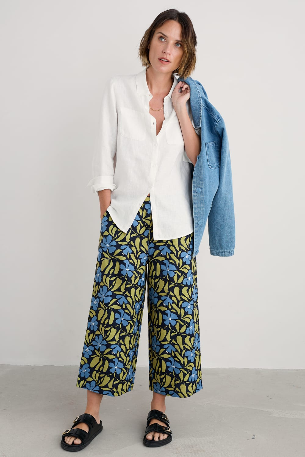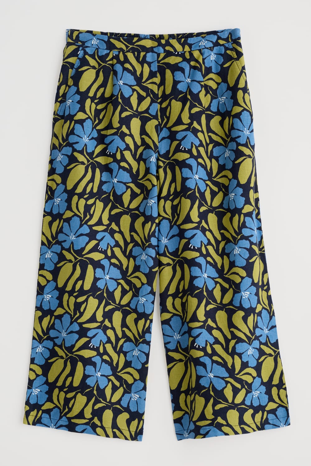 A statement-making style for the warmer months made from soft and breathable Seasalt linen. These cropped, wide-leg culottes feature a beautiful hand-crafted print, concealed side seam zip fastening, elasticated back waist and relaxed side pockets. Pair with a plain, organic cotton T-shirt or coordinating pattern.