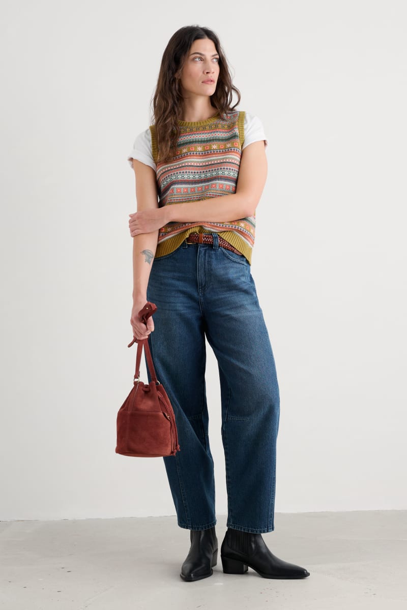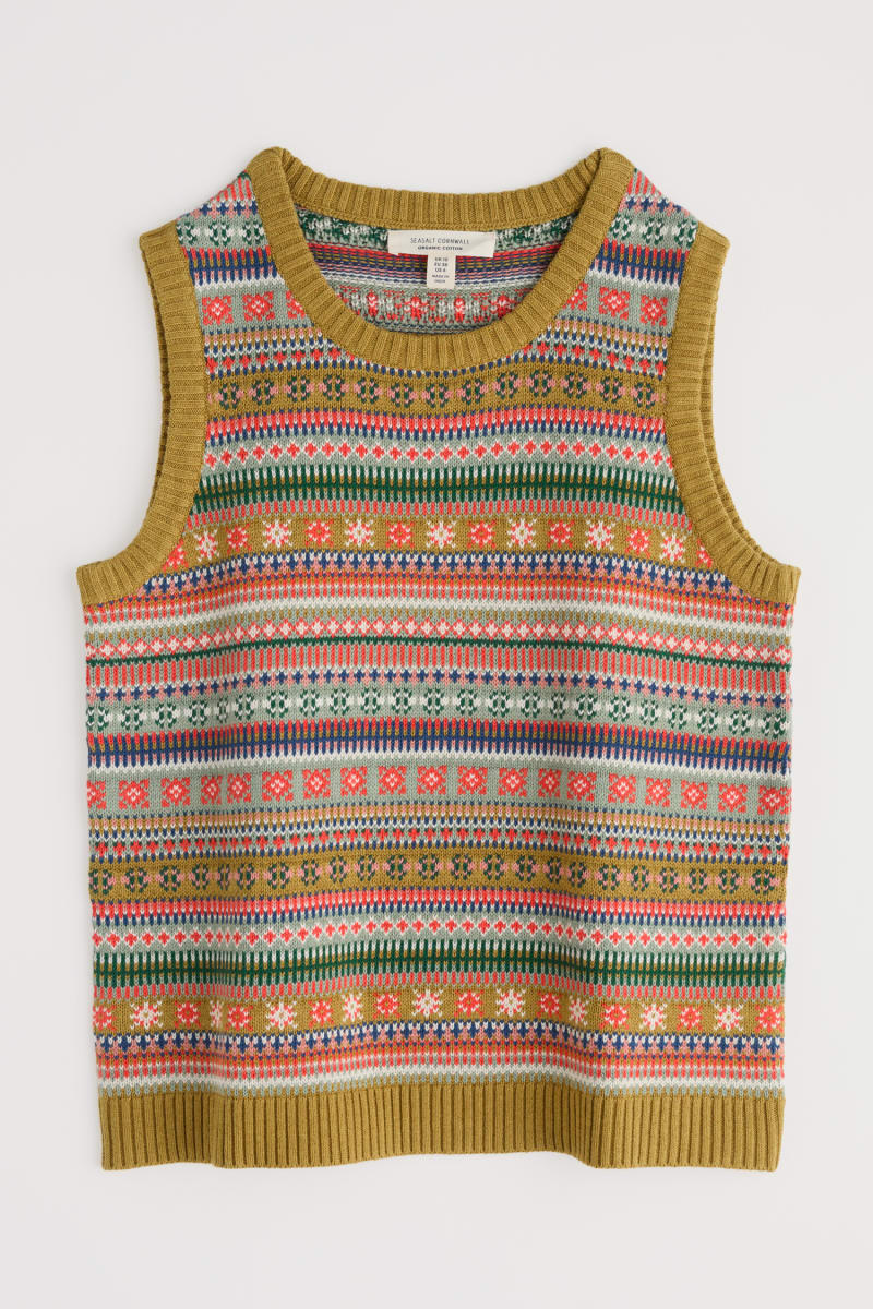 A folk-style Fair Isle knitted vest crafted from soft and breathable organic cotton with a mid-weight knit - perfect for transitional layering. The vibrant stripes give you an array of colours to play with, while ribbed trims provide a traditional touch and a neat finish. Wear over T-shirts, dresses, shirts... The possibilities are endless.