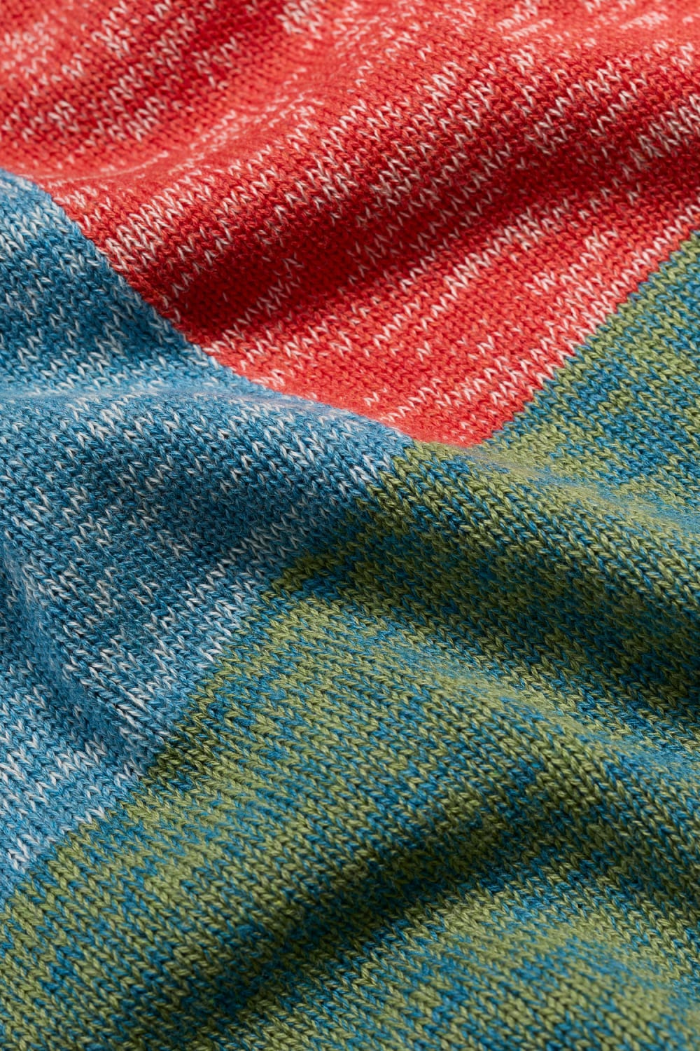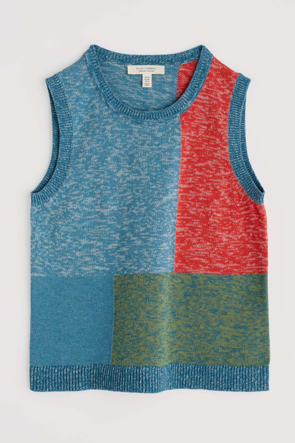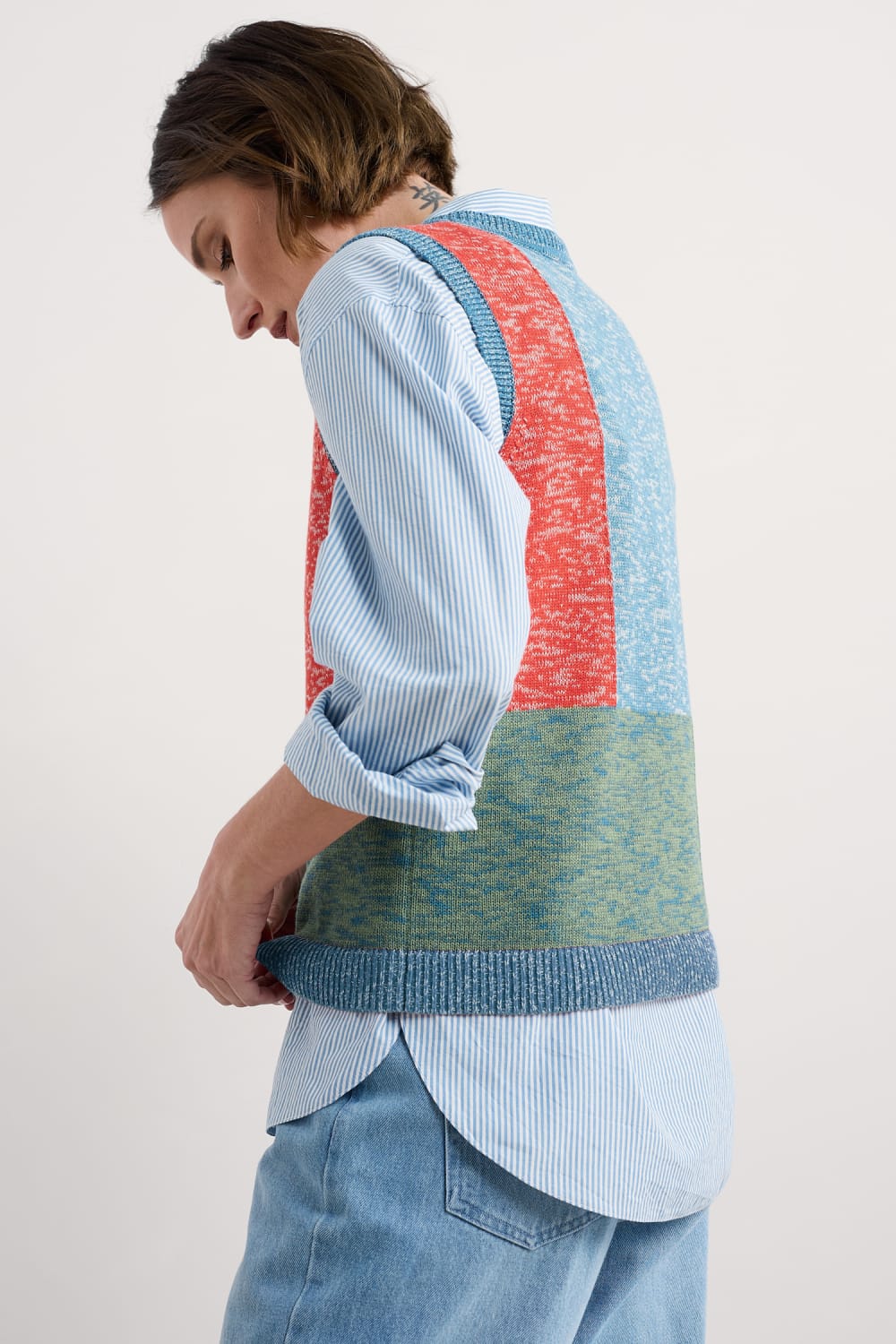 A neat fit vest that makes a colourful statement. Knitted with a pure organic cotton mouline yarn, that blends different coloured . Style over t-shirts or wear on its own.